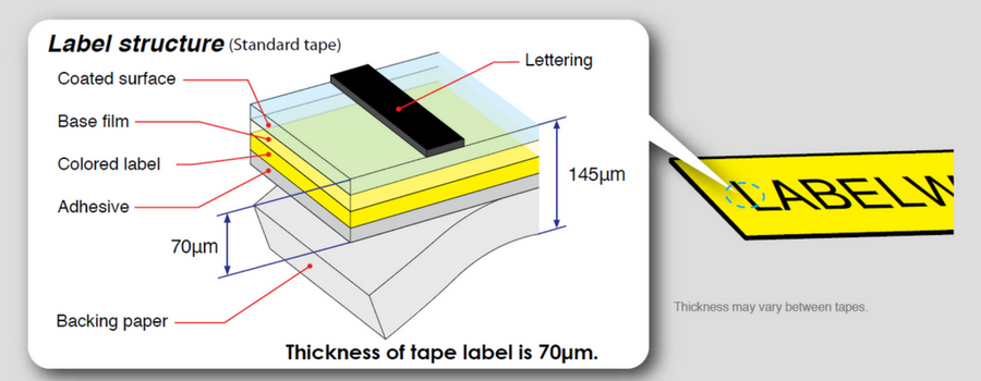 Besides the usual data of tape width, colour combinations and labeling materials, there is some great stuff about the label structure itself. For example, did you know the backing paper (what you peel off the label back to expose the adhesive on the label tape) is 75 microns thick and the thickness of the lettering, coated surface, base film, coloured label and adhesive is 70 microns? This makes the entire thickness of the label and backing paper 145 microns! The diameter of a human hair is commonly averaged at 75 microns. Amazing what is layered in that super thin label.